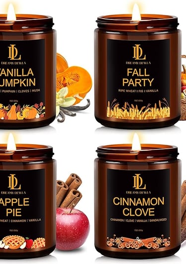 This is a four‑piece set of soy‑wax candles designed for autumn/home‑use, marketed as “Fall Scented Candles for Home, 4 Pack Soy Candle Set, Autumn Gifts for Women or Men, Autumn Scents of Vanilla Pumpkin / Cinnamon Clove / Apple Pie / Fall Party”. The set includes four distinct scent profiles, each one meant to evoke a cozy fall mood.